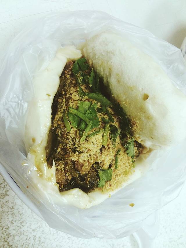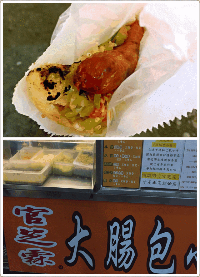 官之霖大肠包小肠:假日时排队的人龙让人惊慌,糯米肠软糯,香肠烤的恰到好处,夹着黄瓜等配料,咬下一大口,确实很满足。