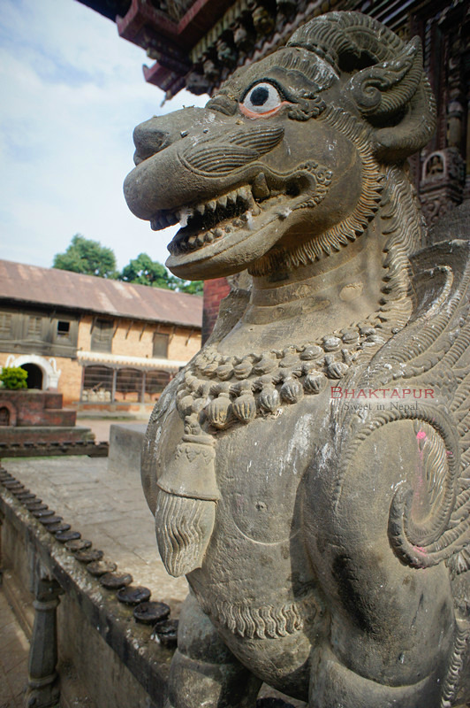 神庙始建于1757年,是一座带天井的三层围楼式建筑。里里外外都是精巧的木雕门窗和围栏。正门对着杜巴广场,门两侧有一对彩色石狮。