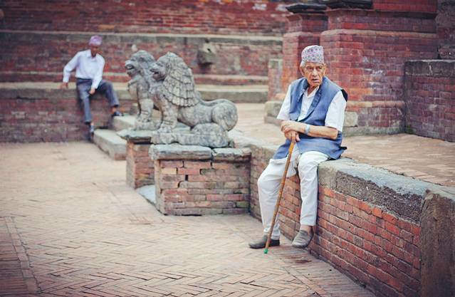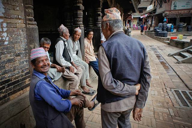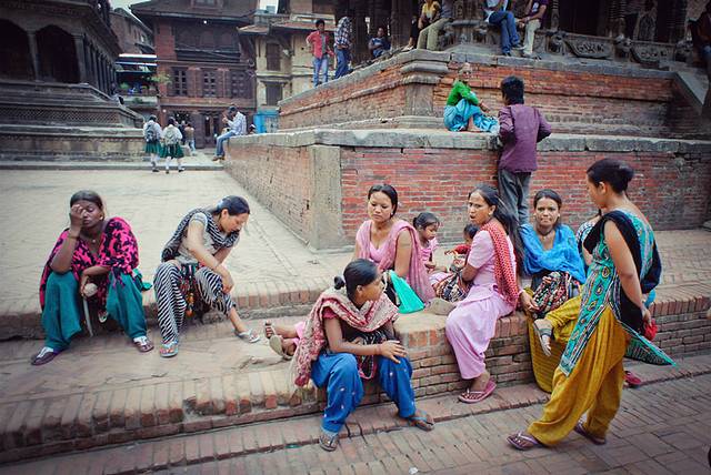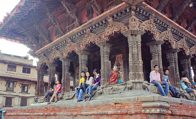 一群人在神庙高高的台阶上享受喜马拉雅的慵懒时光。事实上,只要有阳光,加德满都几乎每一座神庙的台阶或者空地上,都坐满了消磨时光的人们。