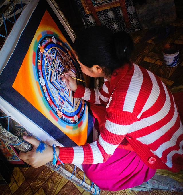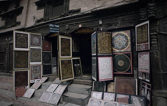 与加德满都古城相比,帕坦少了喧闹,更加显得深远、静寂。在古代,当地人以建庙为生。加德满都几乎所有的庙都出自帕坦人之手。现在帕坦古城居民仍大多从事着金、银、铜器的打造与雕刻、绘画等工艺制作,帕坦民风淳朴,街巷间大小工艺品商铺鳞次栉比。我徜徉在一条条古老街巷,雕刻艺术的海洋,除了对尼泊尔工匠的手艺惊叹之外,还有对这里古典艺术的折服