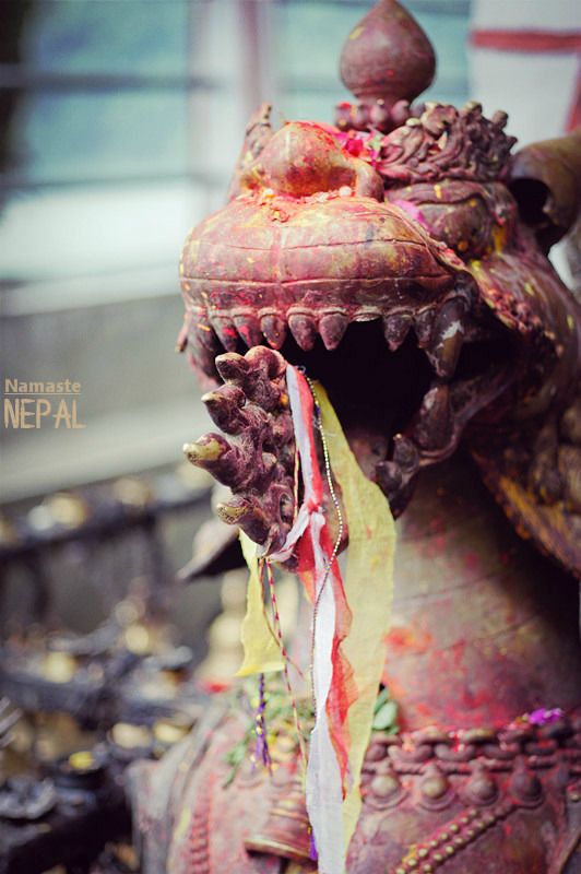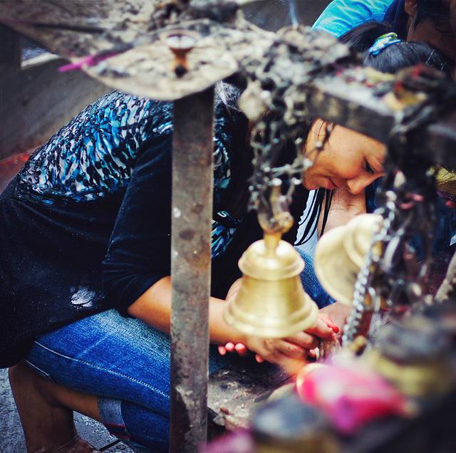 一个初来乍到的外地人,只要已进入尼泊尔的神庙,就会被众多的尼泊尔的神吓得目瞪口呆:太多了,根本数不过来!有人统计过,尼泊尔各种神明加起来有2200万!这甚至比过去的国民人数还多!除了满天神佛,很难找到别的更加适合的词去形容它。事实上,在尼泊尔,你可以看到到处都是神祗,熙熙攘攘的街道旁,忽然冒出一个小小的神庙,不要惊讶——这些神庙告诉你,尼泊尔神无处不在。神庙门口通常都会有一个挂钟,人们进庙前先拉一下钟,告诉神“我来拜你了”。而尼泊尔人额头上常涂有的朱红,也是神存在的标志。