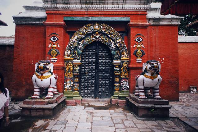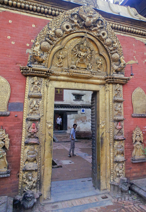 昌古 纳拉扬寺Changu Narayan,它位于加德满都市区东方约20公里处,寺庙坐落于海拔约1540米的山巅,是谷地中著名的寺庙,尼泊尔的世界文化遗产。对我这位游客而言,是对建筑、传统工艺颇有兴趣的,那就不能错过这里。这座双层屋顶的神庙至今还保存得非常完整,无论建筑外形或细节方面,仍然是无比的精致和秀美,显然是一座典型的纽瓦丽人建筑,镀金的大门在灼灼阳光下泛着金光,无关年代的久远。只是每扇大门都紧紧闭着,(只有一门是敞开,非印度教徒不得入内。)看不到里面的任何物件,我的好奇埋没在它的神秘之中。