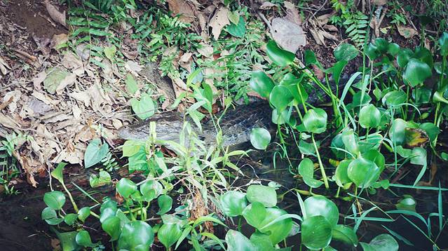 微风徐徐,我将手伸进溪流中,这时向导突然对我说:“不要把手放在水里哦,因为鳄鱼会咬你,鳄鱼特别喜欢chinese food”,额~~~我着实吓出一身冷汗,心里想着,不是来看鸟的么,怎么会有鳄鱼???功课不够仔细啊~~~~~~坐在狭长的独木舟中,我开始神经高度紧张,两只手臂紧紧抱住膝盖使劲往里缩,生怕不小心鳄鱼就从水里钻出来。向导显然觉得刚才的提醒已经达到了很好的效果,为了让我更惊恐一点他还指着一个大洞说:“你看,那是一只鳄鱼的洞,很大,是不是”,我的娘啊,那么大……