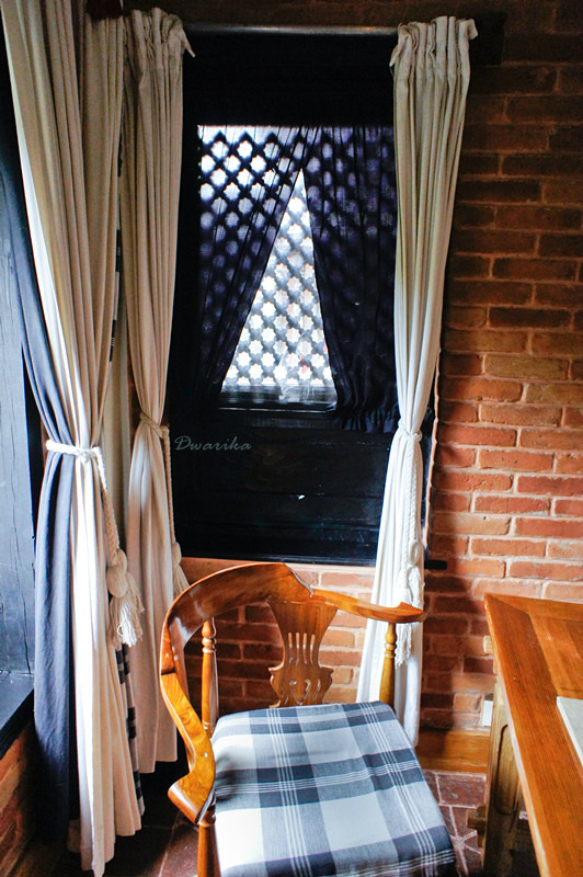 黑白相间的粗布窗帘后面,就是Dwarika先生花费毕生精力收集的百多年历史雕花窗;