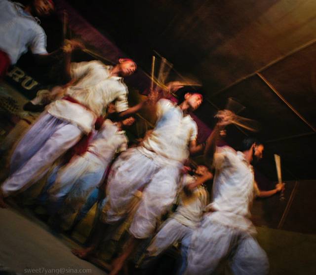 晚餐后,去看塔鲁族人的演出。他们带着鼓乐、带着棍棒,白衣白裤,红色腰带与发带,走了出来。舞台是一个很简陋的空旷场地。这些男人手持短棍,和着鼓声,一面奔忙,一面击打节奏,左右舞者不时相互劈击,你迎我送,就像交战一样,形成循环跃动的圆圈,领舞者手持长棍,动作激越,直将武器戏耍的上下翻飞,滴水难进。兴尽之时,长棍首尾燃亮火光,一面闪跳腾挪,一面舞出一线熊熊火龙……