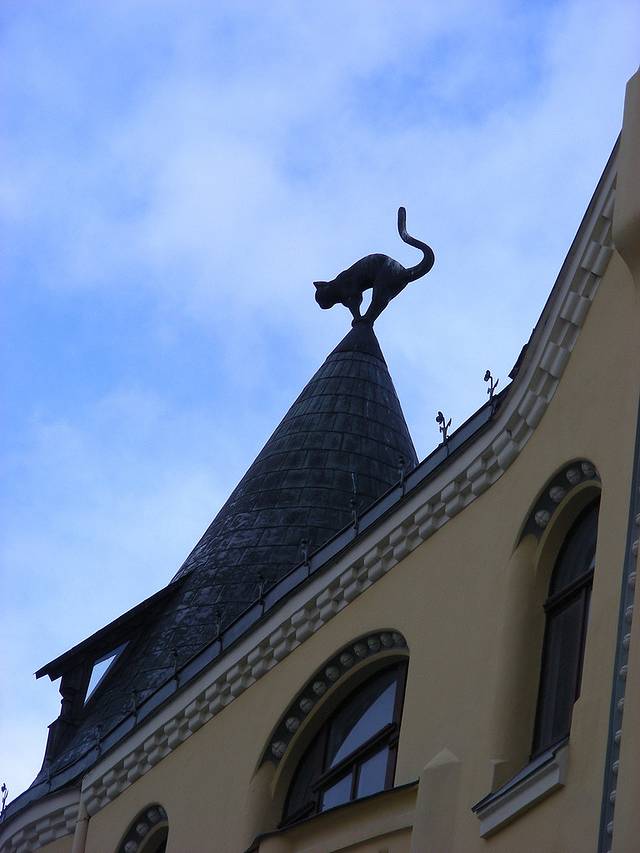 猫屋的主人是个拉脱维亚富商。他申请加入大行会被拒绝,因为他是拉脱维亚人,不是德国人。一气之下,这位商人在住宅屋顶上做了这个黑猫的雕像,黑猫的背和尾巴,对这大行会那栋楼的出口。西方人的迷信认为黑猫在你面前横穿过你要走的路,会带来坏运气。尤其是德意志人更信这个。这个雕像,就好像这只黑猫刚刚从行会门口的路上横穿过去一样。为的就是故意恶心那些行会成员。经过一场旷日持久的诉讼,行会终于让步,接纳这位商人作为成员。这位商人就把屋顶上的猫换了一个方向:变成面向行会门口,就是说,黑猫将穿过,可是还没有穿过这条路。这下就不妨事了。所以,今天看到屋顶上的猫,是面对行会的。
