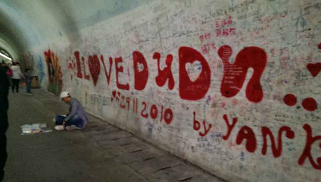 芙蓉隧道,这小伙儿借给我们签字笔一用,我和LG留下送给女儿的话,N年后带女儿来给她看,哈!希望还在。
