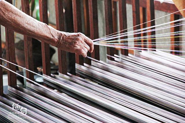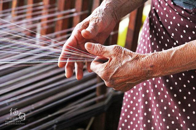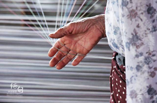 这位老人操纵着无数股不同颜色的线条,晶亮的丝线在她的古铜色的手中汇聚,她不疾不徐地从“纺织机”一头走到另一头,缠绕,再向回走。