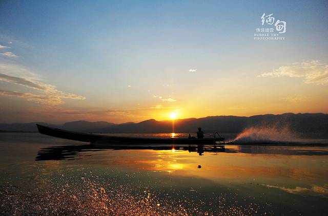 此时太阳已经渐落,夕阳映照着水上屋与小舟,茵莱湖最美的一个时间段来临了。