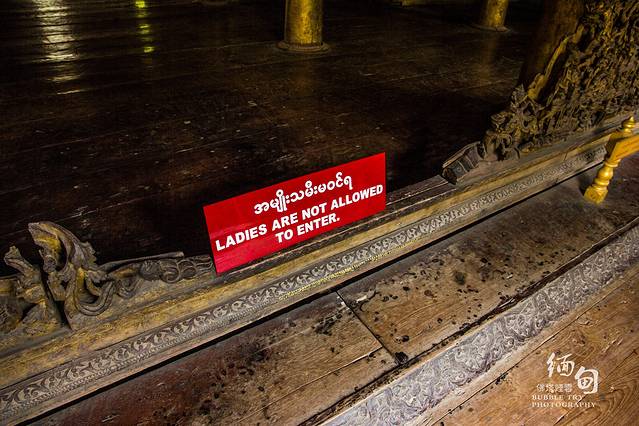 大殿里面靠近佛像的区域只有男性可以进入,女性是禁止入内的。在茵莱湖的帕瑞佛塔也遇见过类似的情况,女性不能为该佛塔内的佛像贴金箔的。