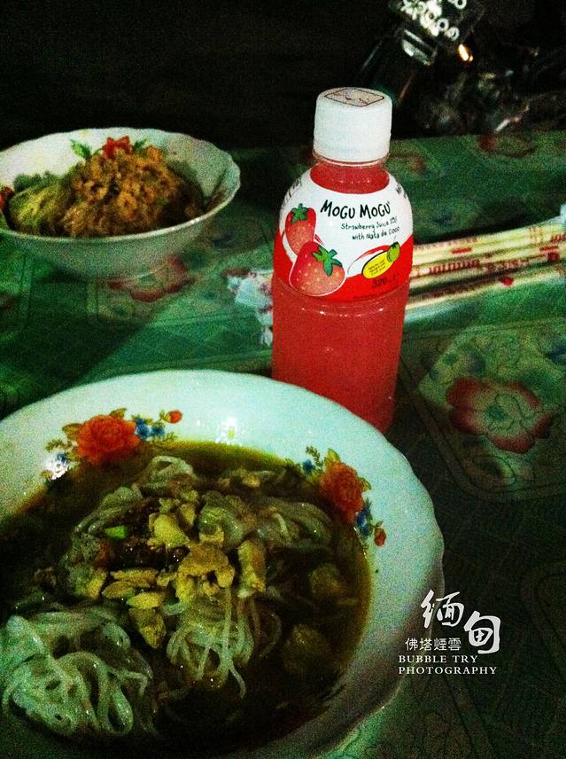 缅甸人还真是完全没有夜生活,饭店差不多八点钟就全都关门了,我们一行人晚上想去找吃的和做马杀鸡的地方,结果最后连一家开门的正经饭店都找不到,最后缩在路边一个小摊儿吃的凉面,出乎意料的是,这竟是在缅甸的这几天里,我吃到的最合乎口味的东西,有点像桂林米粉的感觉,很好吃!老板人很好,我们从茵莱湖一路带过来的牛油果,让她帮忙打成果汁,她也没有收手工费。>w<
