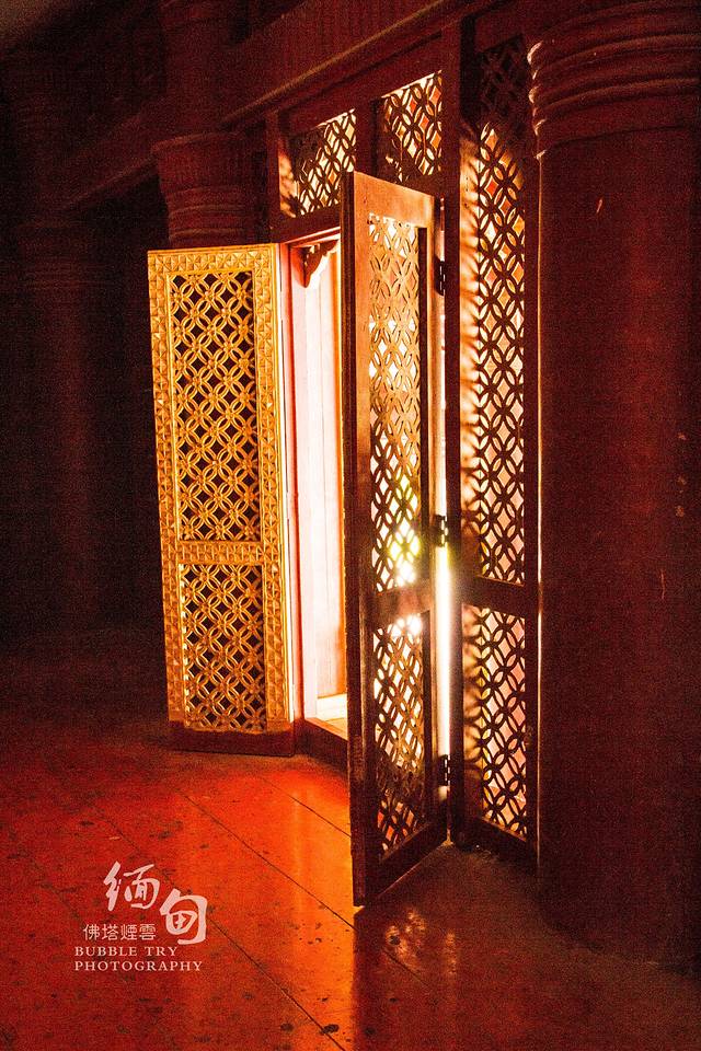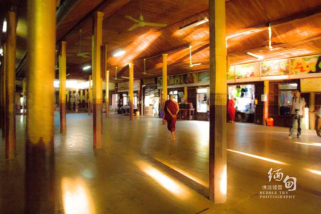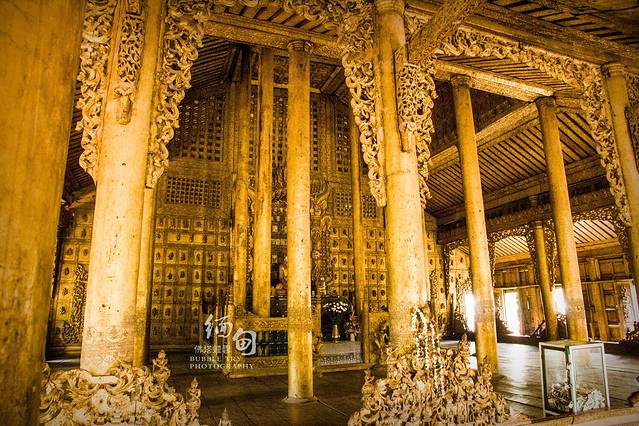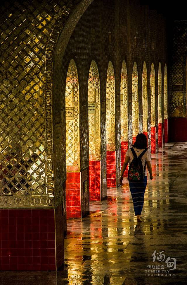 曼德勒的清晨,一桶水泼上寺庙光滑的地面,慢慢摊开,只见晨光里金灿灿的廊柱棚顶,一瞬间在水面映出双倍的色泽,那一刻,惊呆了的我们,如遇神迹。