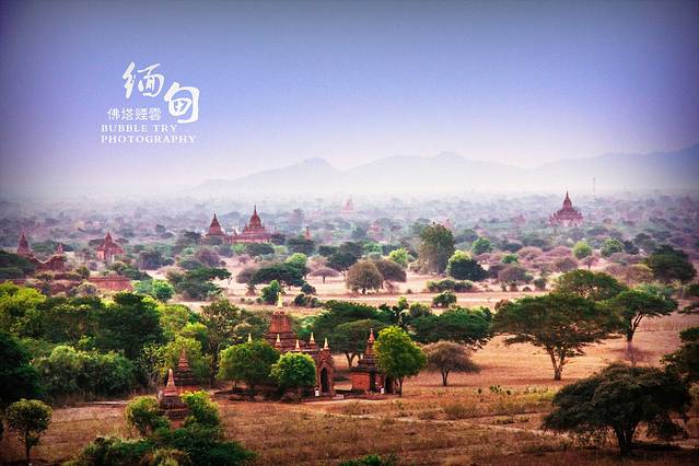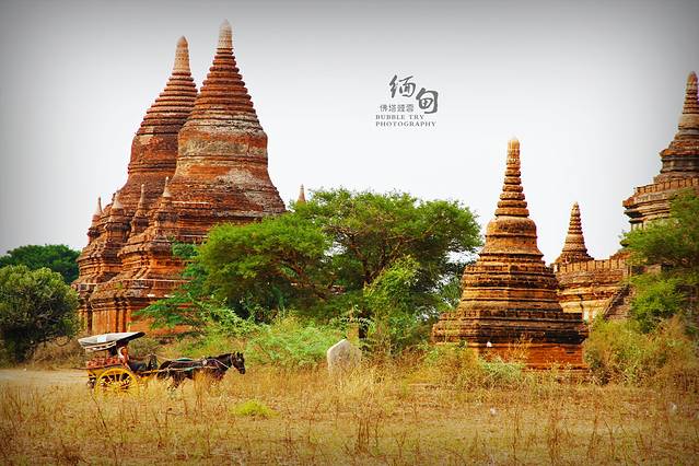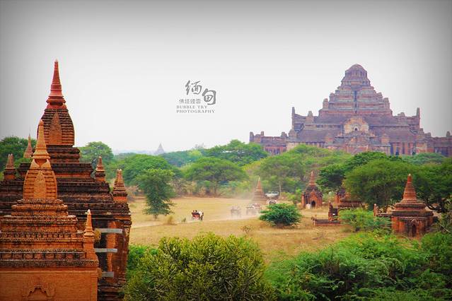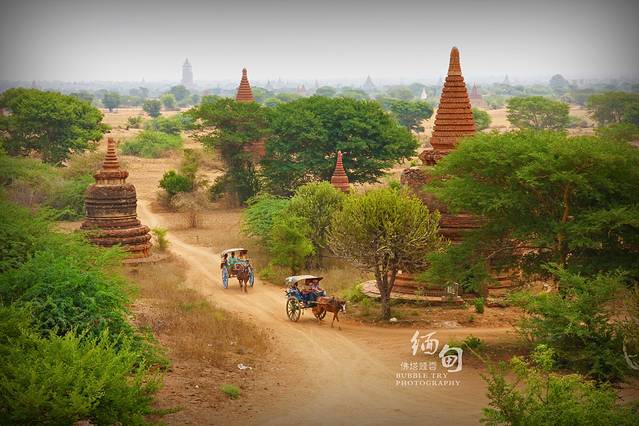 蒲甘的清晨,驶过的马车扬起的灰尘在斜射的光线中飞舞,万千佛塔笼罩在初升太阳的暖色调中,渐渐苏醒,好似一场盛大的表演。