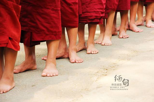 凌晨到达曼德勒,又看到好多人围过来想要拉活儿,讲了半天的价终于坐上了车去旅店。几个累坏了的小伙伴执意要睡一会儿,我、白玛、土豪等几个精神头还比较足的人出们溜达,随便拍了拍街景。此时的曼德勒天蒙蒙亮,而僧人们已经开始了他们的一天,着亮色僧袍赤着脚列队前行,沿路的居民,也一脸恭敬地赠予他们食物。