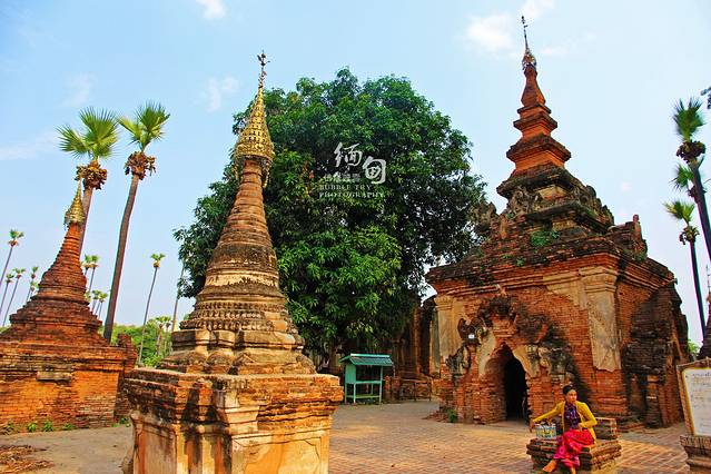 雅达那斯密佛塔 Yadana Hsemee Pagoda Complex,菩提树下的若干小塔,带有沧桑感的红砖。和大多数佛塔不同,这里的佛像是立在塔外的。