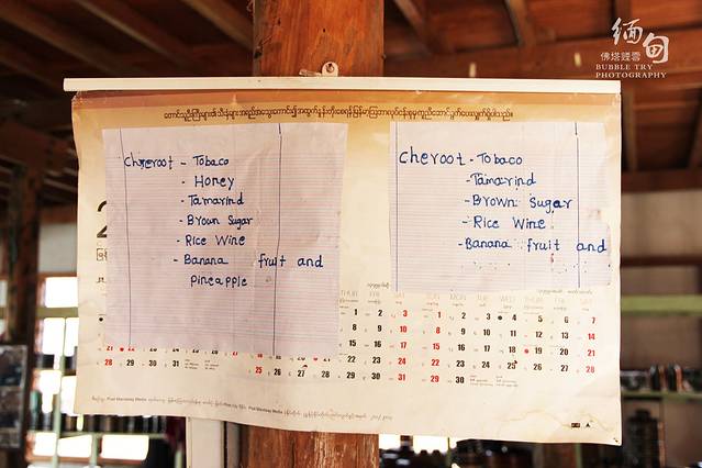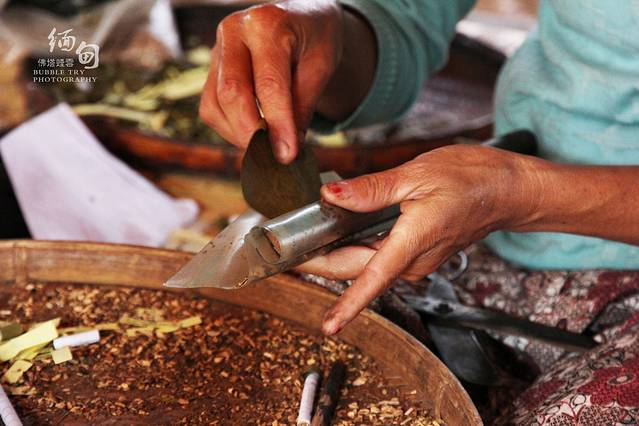 缅甸的烟,除了有产自缅甸中部的烟叶,还有切碎的烟草植茎和软木材,两者比例接近1∶1,还有棕榈糖、丁香、肉桂、罗望子等香料,抽起来味道比香烟要温和得多,却也丰富得多。