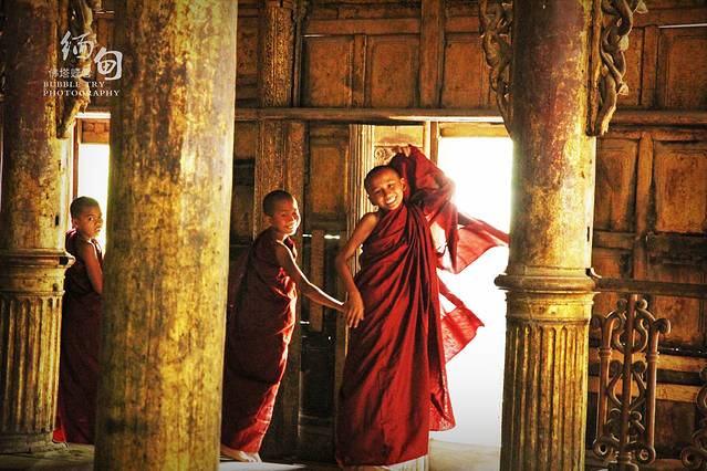 在柚木寺正巧遇见一群小和尚,出门时转脸向我们微笑。