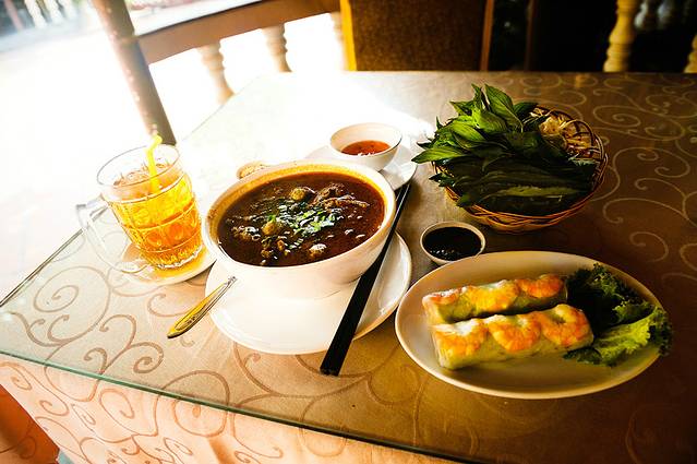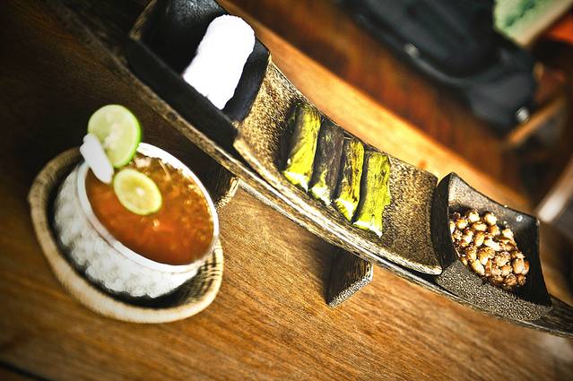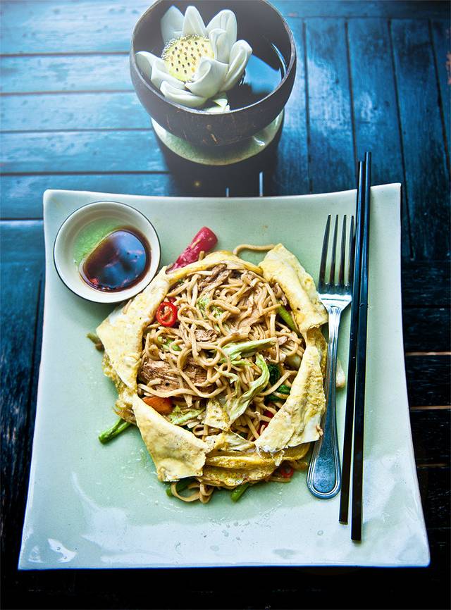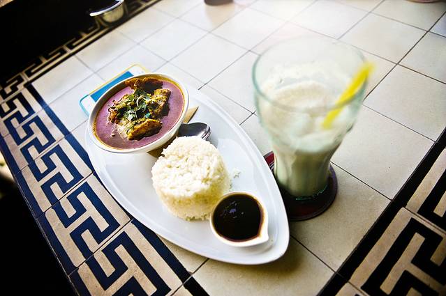 点了份汤汁浓郁的咖啡鸡饭和酥脆可口的柬式春卷,再要了一个新鲜的椰果,