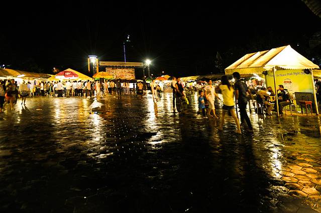 沿着河边慢慢往前走,不知觉逛到当地的夜市,当地的人们在这里逛街购物喝酒耍朋友,好不热闹。夜市中央,还有帅哥美女在表演歌舞。