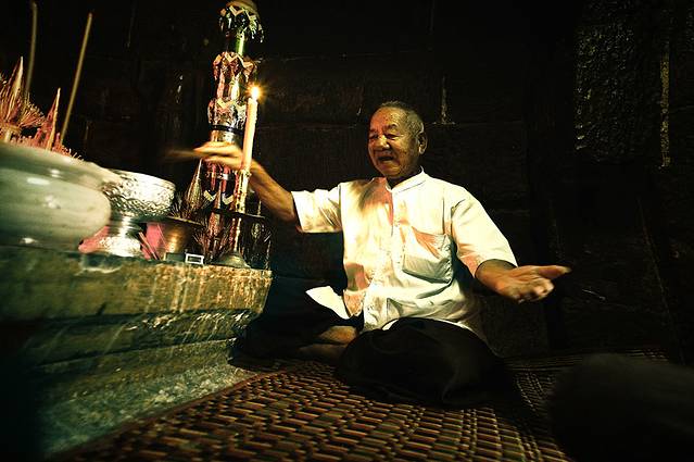 阶梯很陡。跟随四个老外帅哥爬上陡峭的石阶,一进去就被一老头递上梵香要我点上,我跟着帅哥们稀里糊途地接过香,拜三下,摸摸神像的头,再碰碰自己的头。然后老头揭开一块红布,里面放着一些美元,再指指我们,又指指盘子。第二次发生这种事情,我自然懂了。