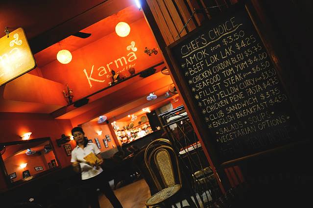 在一家叫《karma》的餐厅坐下,餐厅有着着桔红的墙壁,复古的壁灯,老旧的餐桌以及似有若无迎风飘来的音乐。