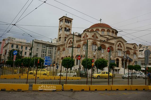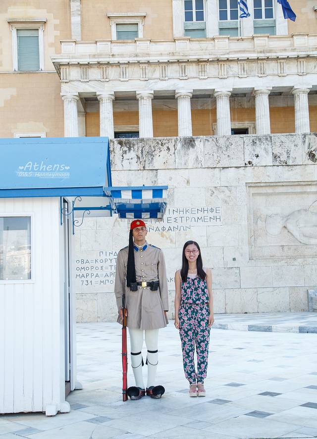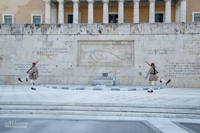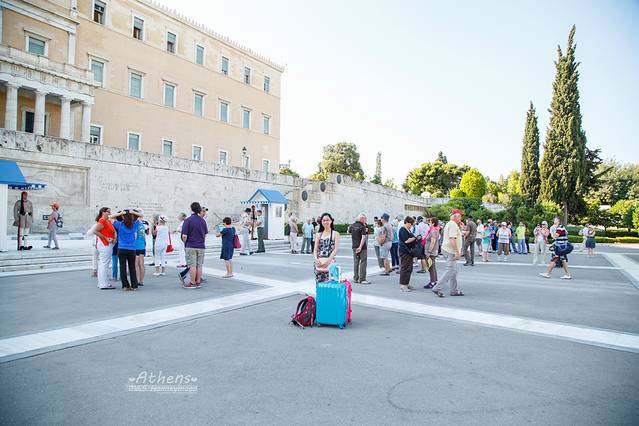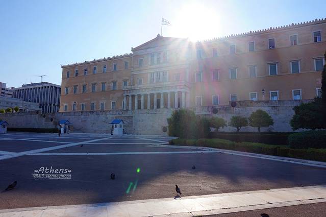 从Piraeus港口搭地铁到Syntagma宪法广场站,出站过马路即是宪法广场。说是个广场,其实面积很小,中国任何城市的中心广场都比这个广场大,但是这可是雅典城乃至希腊国家的象征性广场,意义非凡。宪法广场是希腊议会前的广场,政治游行集散地,广场上的无名烈士墓由穿着传统服饰的士兵把守,士兵的着装比较有意思,戴着黑色长流苏的猩红军帽,身穿毛料男式裙、白色毛料长袜、黑色流苏膝带,搭配一双黑绒球的红色sarouchi鞋,手提上刺刀的步枪。每个小时整点他们都会进行换岗,游客们多会记录下这一时刻。