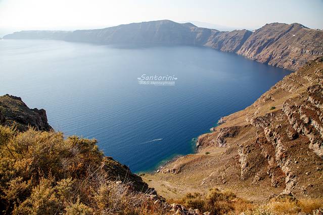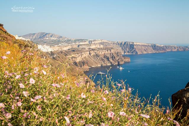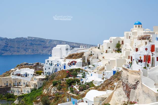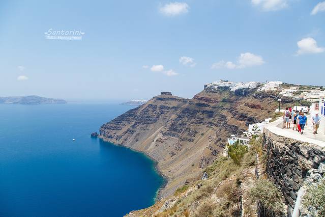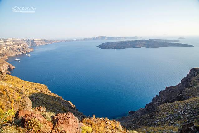看着眼前的美景,不顾凌晨5点起来拍婚纱照的疲惫,又迫不及待启程去走悬崖步道了。由Fira—Firostefani—Imerovigli三个小镇串联起来的悬崖步行道,经典的蓝白房子在这里,是精华所在。全长约3公里,如果从Fira作为起点是向上坡方向走;如果是从Imerovigli开始往Fira是下坡方向。在步行道上可俯瞰爱琴海、眺望火山岛、欣赏日落。这里的日落和伊亚唯一不同是太阳是落入火山岛背后,而伊亚是看到太阳落入海中。步行道是南北方向,中午时间拍照最佳,太阳垂直照射小房子,没有阴影。