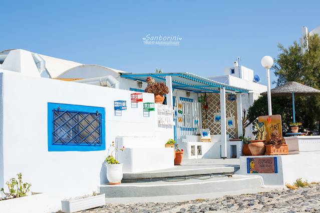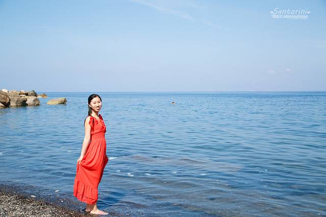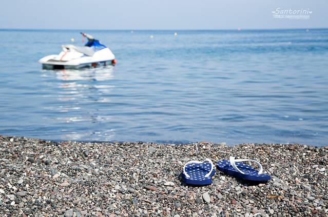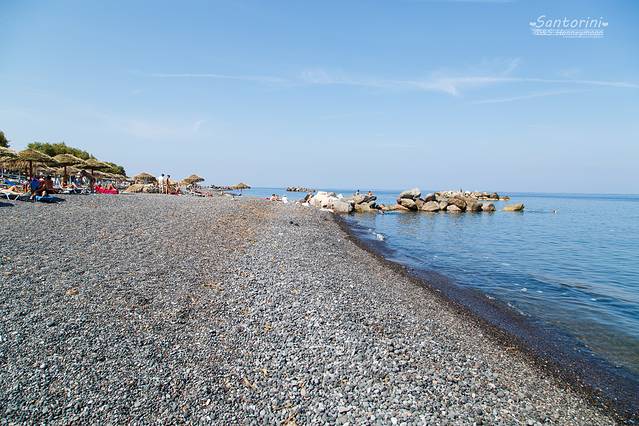 圣托里尼有两个比较出名的黑沙滩,一个叫Karmali卡马利黑沙滩,一个叫Perissa,两个沙滩直线距离不远,但是开车要绕一个大圈。沙滩本身不美,海滩上铺就的不是沙子,而是一块块黑色的卵石,都是火山喷发留下的火山石,被太阳晒过后很烫脚,最好穿着拖鞋,不要光脚走沙滩。