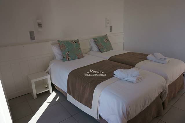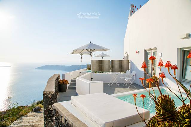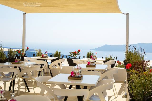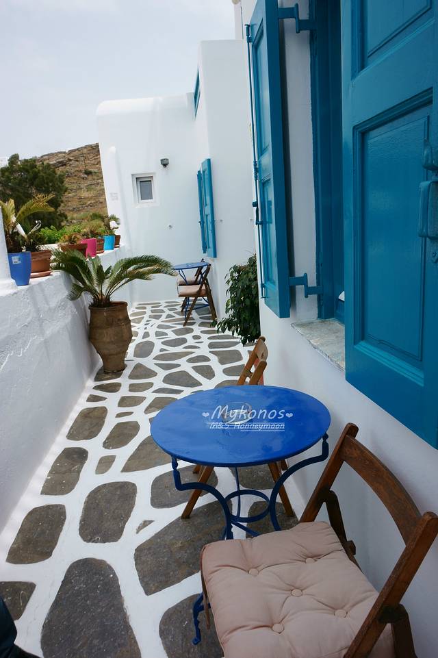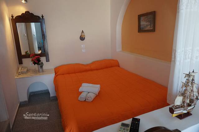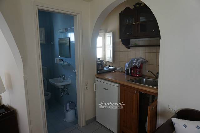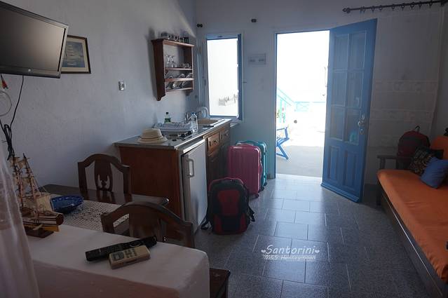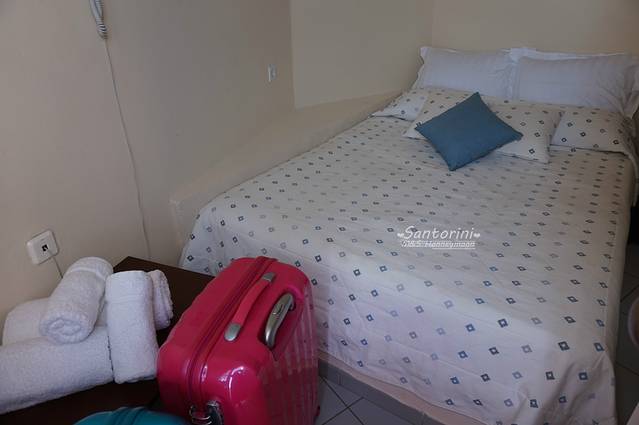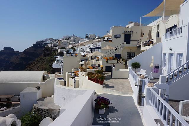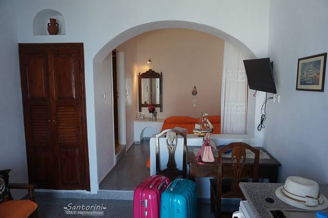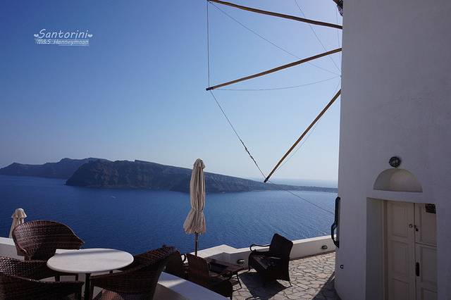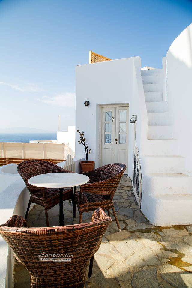 完成一早上的拍摄已经是上午9点半了,肚子饿得不听使唤,于是我们赶忙回酒店享用自助早餐。还没来得急更换衣服,穿着婚纱去吃早餐显得有些另类,不过也得到了很多人衷心的祝福吃过早餐就收拾东西退房前往Imerovigli镇的酒店。酒店老板很细心,早餐时就询问了我们退房时间并提前将发票写好装入了信封内。离开时酒店工作人员还开车将我们送到了公交车站,我们乘坐Oia到Fira的公交车在Imerovigli站下车,往悬崖步道的方向走到一个停车场边就能看到Annio酒店的指示牌了,顺着台阶往下走就能见到酒店接待处。路程不算很长,但是拖着沉重的行李箱下台阶确实也挺辛苦但当老板娘领我们到达住宿的房间时,发觉一切辛苦都是值得的,暖色调的小房间,还有无敌海景阳台,满满的爱琴海装修格调,大爱啊!!!在悬崖酒店里算是性价比很高的了!这间酒店住宿的中国人很多,我们住宿期间,隔壁房间、楼上房间和斜对面的房间都住着中国人,发觉中国人在圣托里尼都是包场的节奏哇!!