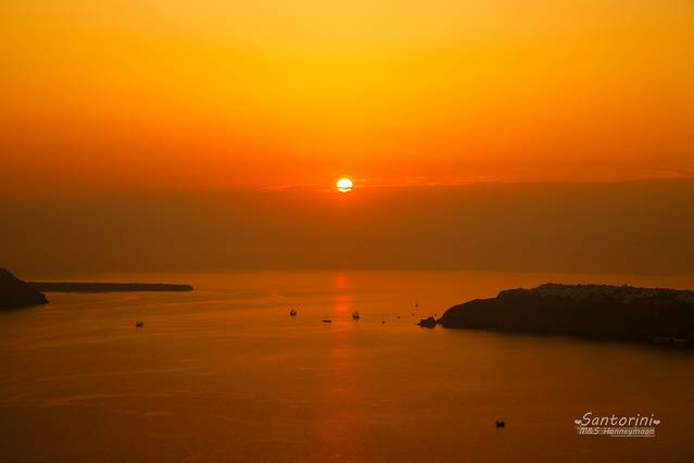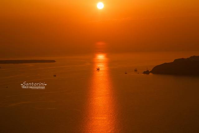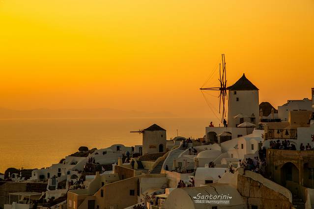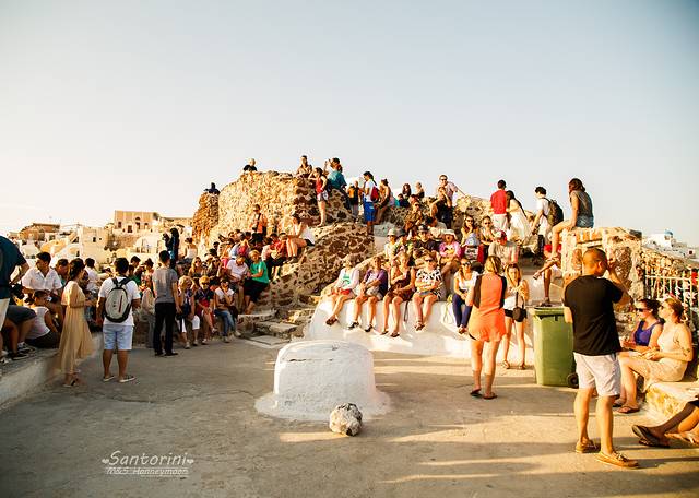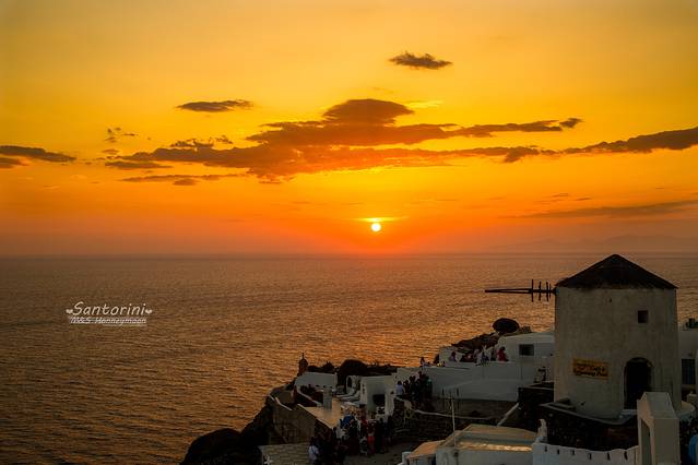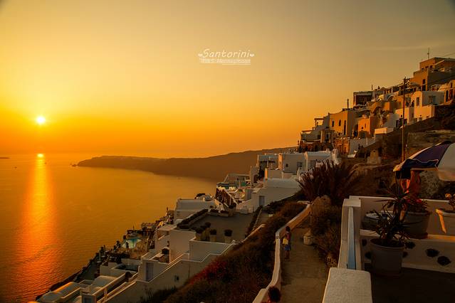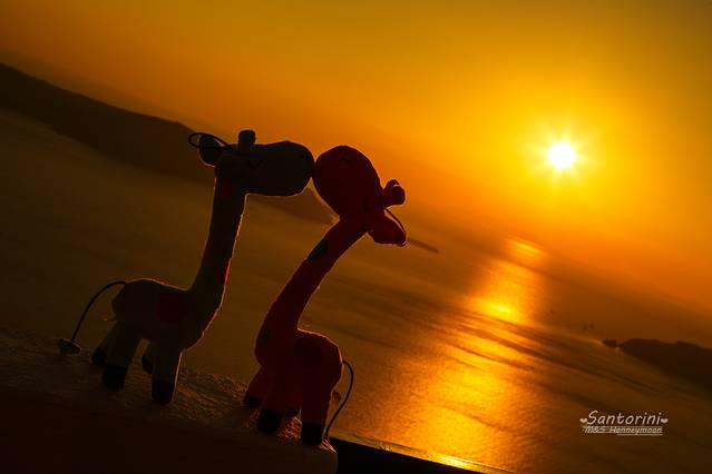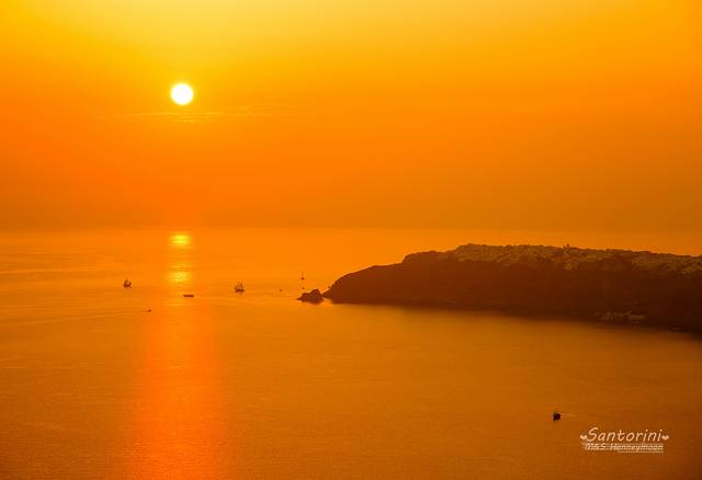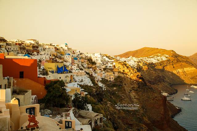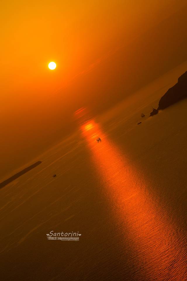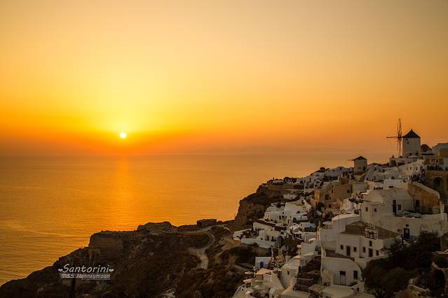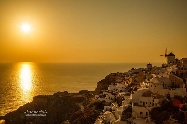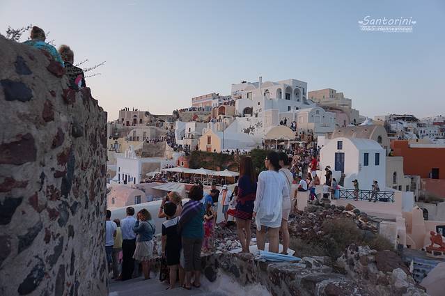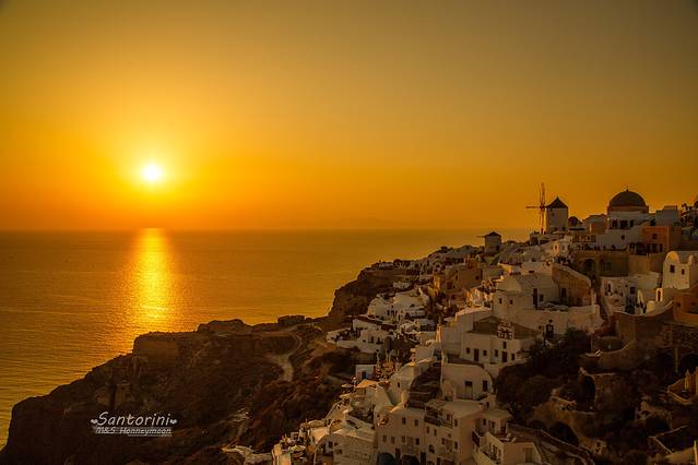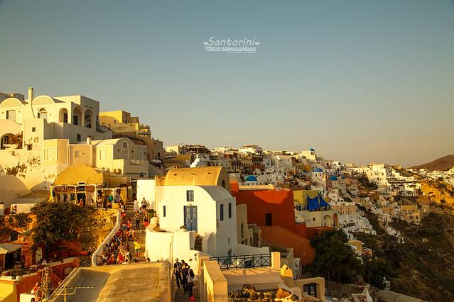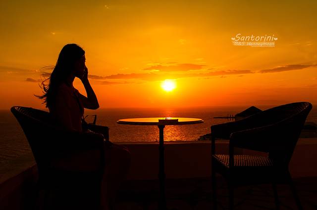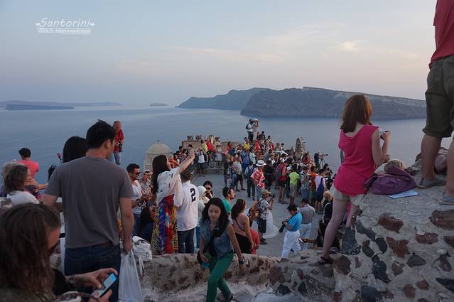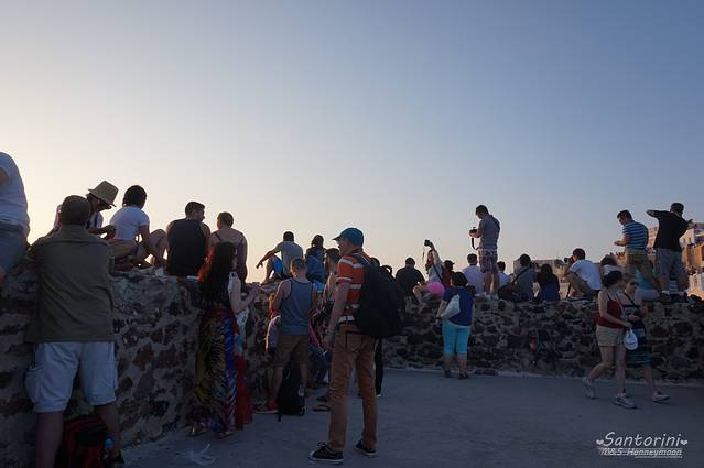 今晚的日落堪称完美,没有一点云彩遮挡,日落下的小镇美得令人陶醉。坐在老公旁边拍日落的是一个来自广东的女孩子,好不容易挤上了岩石边,望着如此的美景,一直用粤语说着“好靓啊”~~~ 她很羡慕我们蜜月旅行来这里,觉得这里真是美呆了!!!