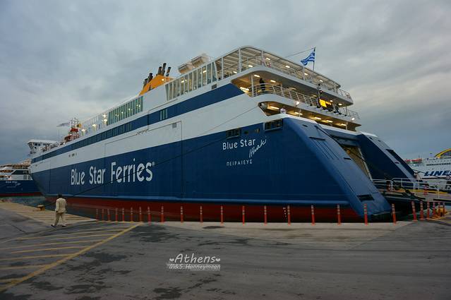 2、Blue Star Ferries蓝星公司http://www.bluestarferries.com/site/content.asp?loc=2 这是希腊最大的船公司,经营的都是慢船,价格比较便宜,航线多。蓝星的船大而且稳,不容易晕船,船上设施很好,总共有7层,底下5层都是停靠车辆的,最上面的两层是坐人。船上有餐厅、咖啡厅,价格消费不算贵,还有商店可以购物。在咨询台可以免费领取本船航线经过的旅游岛屿的地图,很详细。购买经济舱的票就足够,除了商务舱以外的地方都可以随意坐,餐厅的沙发位置很舒服,甚至可以躺着睡觉。船舱外也有座位,都是可以随意坐的,很多老外喜欢坐在外面吹着海风,享受阳光。