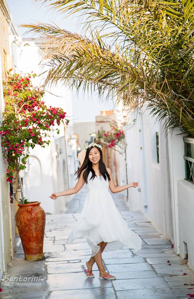 * 女士尽量穿一双舒适的鞋子进行拍摄,圣岛的悬崖道路都比较陡,若穿着高跟鞋很容易摔跤,切记要穿平底鞋。