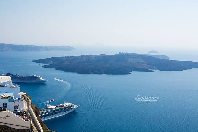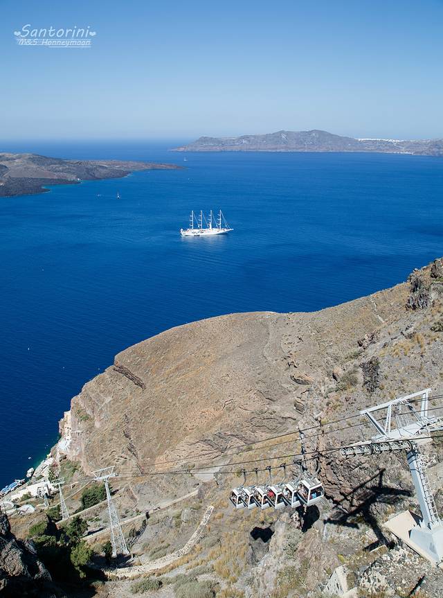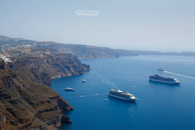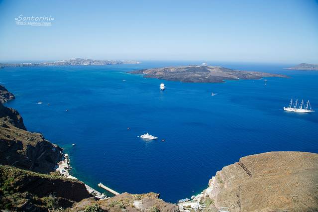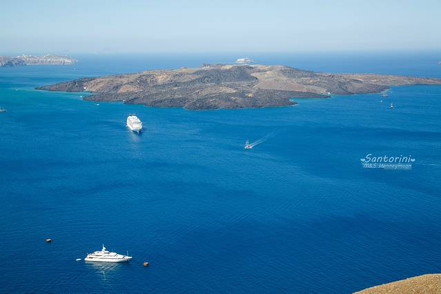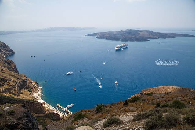 悬崖下依旧是美丽的小海湾~~~停靠在海中间的游轮,在不断利用小船向岛上输送游客,估计是游轮停靠圣托里尼,让游客短暂上岛游览吧!