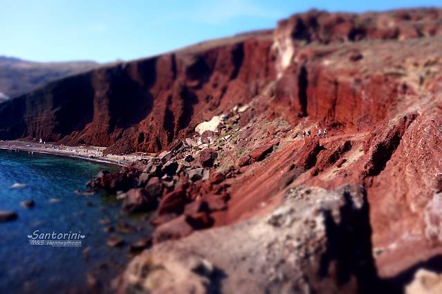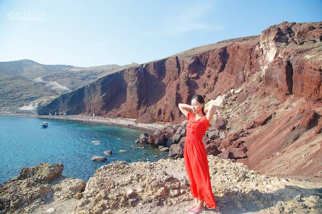 紧接着去红沙滩Kokkini Beach,这也是圣岛很特别的一个沙滩,由于细砂与海边的山崖呈现出火红的色泽得名,沙滩的沙很细,后面被红色的火山所环抱。沿着岩石走,就会发现红色的岩石逐渐变成白色,这也是附近一个白沙滩得名的原因。