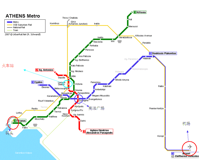 X95是宪法广场到雅典机场的快车,车程大约一小时,全天24小时运营,单程5欧元一人。若在宪法广场上车,在宪法广场对面一个小斜坡下去就能看到X95公交车,在旁边的售票亭购票,买票只接受现金。若从机场上车,走到3号到4号出口可以找到售票亭。上车后记得在打卡机上打卡,打卡机在车子的中部和后部,把票塞进打票机吱吱两声打上日期就OK。大家记住一定要打卡,若买了票没有打卡被查到会被重罚的。