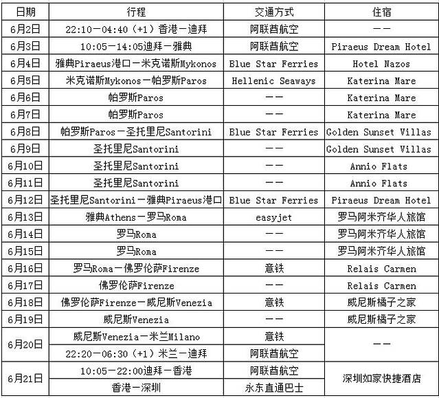 旅行时间为6月2日—21日,共计20天,共到访两个国家:希腊和意大利。(这里只列举了出境的部分,国内往返程我将此省略了)