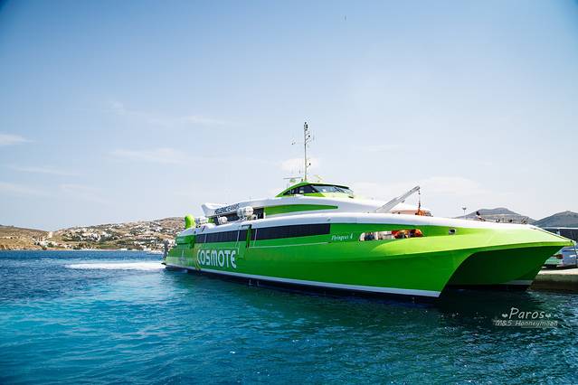 3、Hellenic Seaways快船公司http://www.hellenicseaways.gr/ 这是一家快船公司,价格比蓝星公司的慢船贵,但速度挺快,我们这次从米克诺斯到帕罗斯就坐了这个公司的Highspeed 5,40分钟就到了。但快船比蓝星的船小,稳定度没蓝星那么好,风浪大的时候容易晕船,而且船舱是密闭的,没法出去看风景。