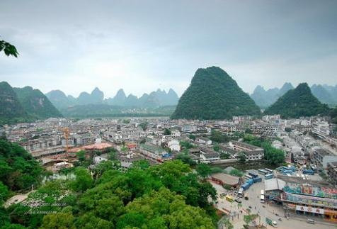 桂林到阳朔有80分钟的距离,车子在桂林市中心走过,桂林市区的景色也一览无遗。第一感觉,这是一个有点破旧的城市,城区并不大,房子也显得很旧,但绿化很好,街道也很干净。快近阳朔的时候,我们看到了这里与众不同的山峰,很奇特,也很美丽。是一个个独立成型的小山峰,与我们平日所见的连绵起伏不同,别具一格。车行途中,上来了一位年轻人,他问我们是哪里人,并自我介绍说自己是阳朔都利中学的英语教师。后来,我们又询问了阳朔旅游中的一些问题,他一一作答,并介绍我们到阳朔观景楼主题客栈去住,原因很简单:价格便宜又方便。我们很高兴遇到了一位热心的当地人,避免了人生地不熟带来的不便。