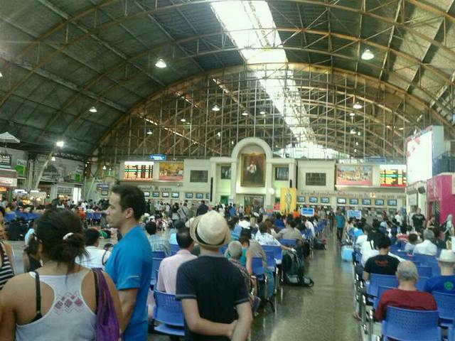 今天晚上要坐火车去清迈,早上就退了房,找另外两个同伴入住的HOLIDAY INN,在SILOM街上,离CHONG NONSI站很近,他们出去逛街,我又在酒店里睡觉了,哈哈.是不是很懒.但舒服啊.由于是晚上7:35的火车,所以我们也不着急,同伴是洲际的会员,可以到下午4点在退房,我们也就呆到了下午4点.由于大包小包,就没坐地铁去华南蓬火车站.就在酒店门口叫了一辆,这次我们向出租车低头了,酒店的服务生说去那边没出租车肯打表的,问我们200B是否愿意去,他们说人均50B也就去了,我们也就答应了.出租车司机看上去还不错,也可能是我们给的钱多,态度很好,帮忙拿行李,还会两句英文,其实从酒店到火车站很近,大概只用了15分钟就到华南蓬火车站了.