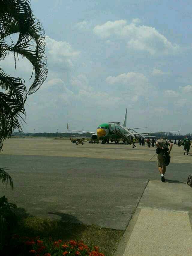 航班很准时,亚航的停机位不错,虽然没用廊桥但机位离登机口并不远,但还是要用摆渡车,半分钟就到了,很多人都说这么点距离走过去就好了,国内的机场管理的比较严格吧.想想在LCCT都是靠走的,呵呵.大概飞了4小时50分钟,到达了曼谷的廊曼机场,由于在飞机上已经换好了夏装,下来感觉还行,但还是觉得和武汉的温差很大.