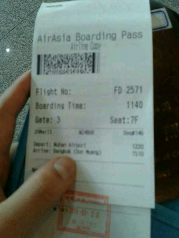 航班时间是12:20,亚航的值机柜台大概有四五个,人很多,但还比较有秩序,其实武汉-曼谷除了这一个航班外另外还有一个包机航班,听说武汉吉隆坡也有了包机航班,希望以后能转正.我们事先没有在网上值机因此座位也没有分配在一起.在值机的还发生了一个插曲,因为同行的两个人带了两个大箱子,自重比较大,他们两个人的大箱子往上一放正好20KG,不多不少,自然我的包包就不能托运了,还好我的包不大,可以托可以背,我背着两个包也上了飞机,亚航的工作人员也没有管我.所以带着背包的同学不用太担心会被称行李,我觉得亚航的原则就是只要你能背的起来的一个大包他们就让上飞机,但如果是拖的行李箱,只要超过了他们规定的限制就要交行李费.出关也比较顺利,边检的大哥还和我聊了两句,感觉很亲切.呵呵.