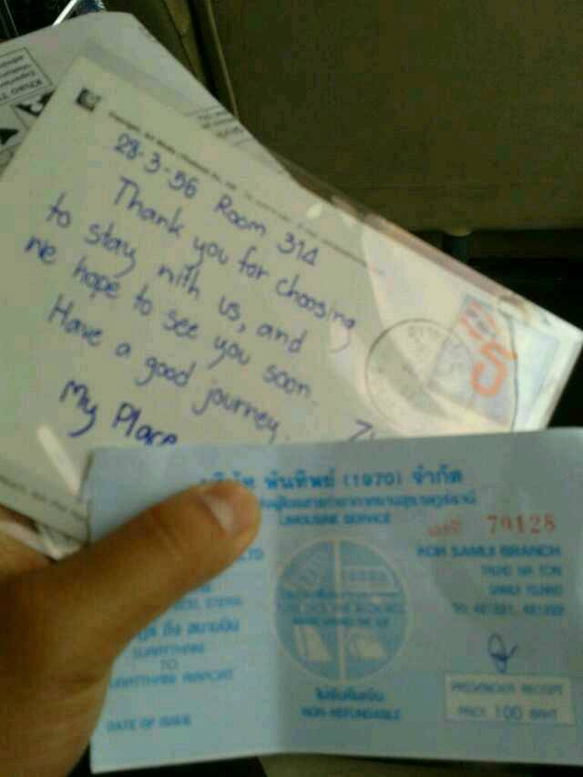 另外还在素叻它尼住了一晚,是家很小清新的酒店,名字叫MY PLACE,非常的便宜,如果有朋友要在这里过渡,非常的推荐.在AGODA上预订的,132块人民币一晚,非常的干净,而且交通方便.酒店的服务非常细致入微,给每个入住的客人一张简易交通图,还有具体的航班时间对应的机场大巴时间.退房的时候还送一张本地的明信片.服务非常的贴心.