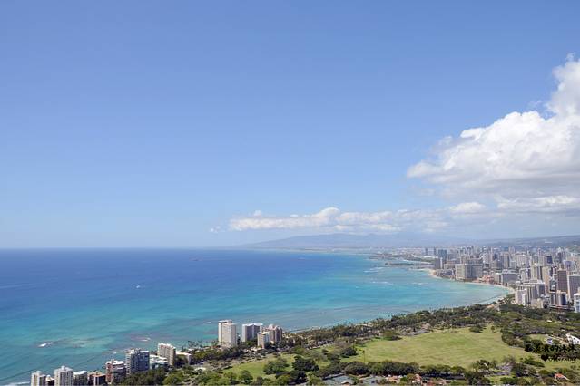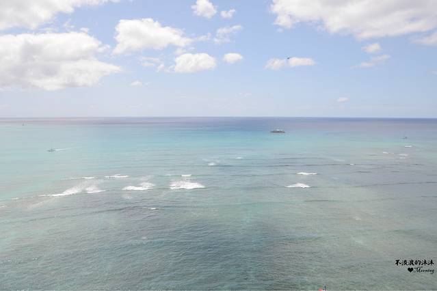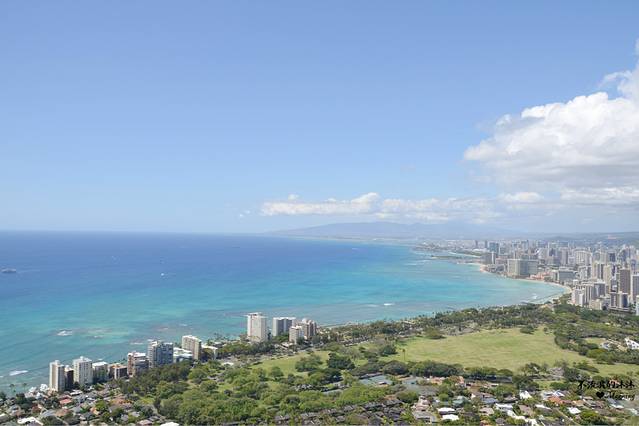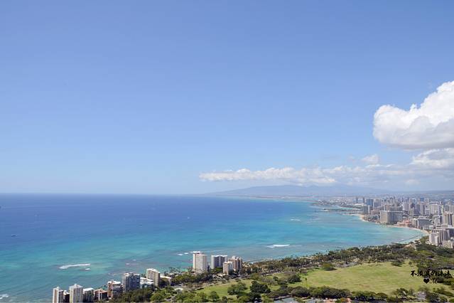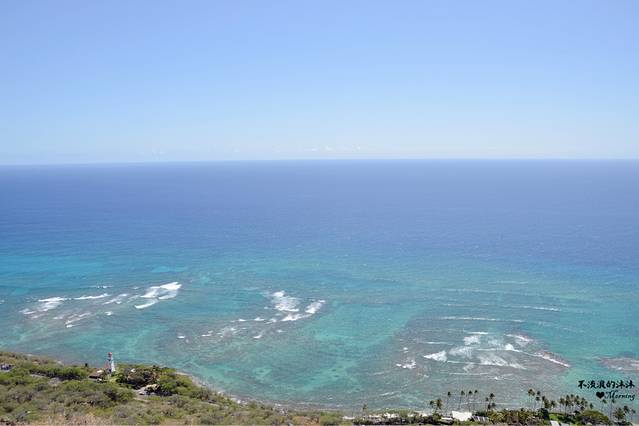 爬山自然是累的,但是每一段路都有个观望台,放眼望去,能看到不一样的风景。有时候是一朵不一样的云,有时候是一片沙滩,有时候是Waikiki的酒店区的繁华。夏威夷海滩跟别人不一样的是,靠近陆地有很大一块浅水区,长着很多珊瑚,适用于浮潜。甚至站在水里就能看到小鱼游来游去。我们在19层的酒店,居然也拍到了一直海龟得瑟地在水里游来游去,可见水有多清,多浅。另外一个特点就是浪多。Waikiki不少沙滩在靠近岸边的地方,有一个高起来的小堆,为的就是把浪挡下来,这样靠近岸边的海水会比较平静,很多小孩都在那一片海滩玩。当然最惬意的还是租一个冲浪板,抱着板子在水上漂浮,随着浪花一阵一阵地翻涌,人也不断漂移。这种玩水的乐趣,下次再来体会。