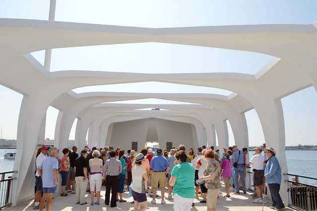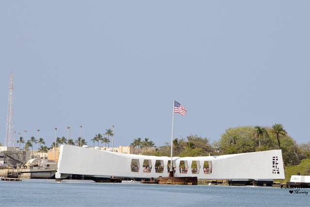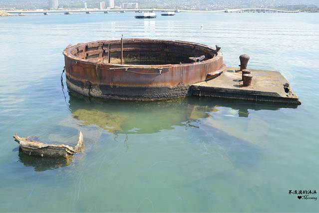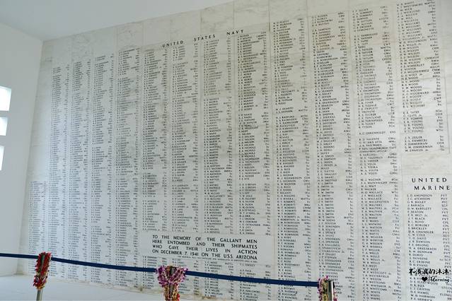 珍珠港事件,美国虽蒙受重大伤亡,死亡2390人,共有12艘战舰沉没,9艘损坏(8艘战列舰5艘沉没),后来展开了大规模抢救行动,除了亚利桑那号、俄克拉玛号、内华达号之外,基本上都修复好重新回到战斗服务中。坐船去亚利桑那纪念馆的途中,看到了水面上浮起来的小牌子,上面标注了三条沉船的名字,底下永远沉睡的,就是那些船了吧。Arizona白色的纪念馆呈船型。中间有个空洞,可以看到生锈的沉船,长满了珊瑚,一条美丽的热带鱼,优雅地飘过。船底还在漏油,一滴滴,像黑色的眼泪。纪念馆里,密密麻麻,刻着那些沉睡在水里的人的名字。在最新的石板上,甚至有那些当年的幸存者,死了以后,再回到这个纪念碑上的人。导游说,如果有认识的任何当年的幸存者,想死后加入这个名单的,随时可以。在离开的时候,我看到一个老兵,坐着轮椅,白发苍苍,戴着个帽子,帽子上清晰地写着:“Pearl Harbor survivor association”,看他的年龄,我看应该是当年的幸存者吧。心里油然起敬。也许,他也很想念那些同伴吗,也就是那一天,因为什么样的原因,他活了下来,但是他不敢相信,当初那些躺在一个船舱的同伴们,却永远保持那样惊恐的姿势沉睡了下去,有的甚至炸得体无完肤,尸体的灰烬在空中飘散。这些年,他也应该常来吧。