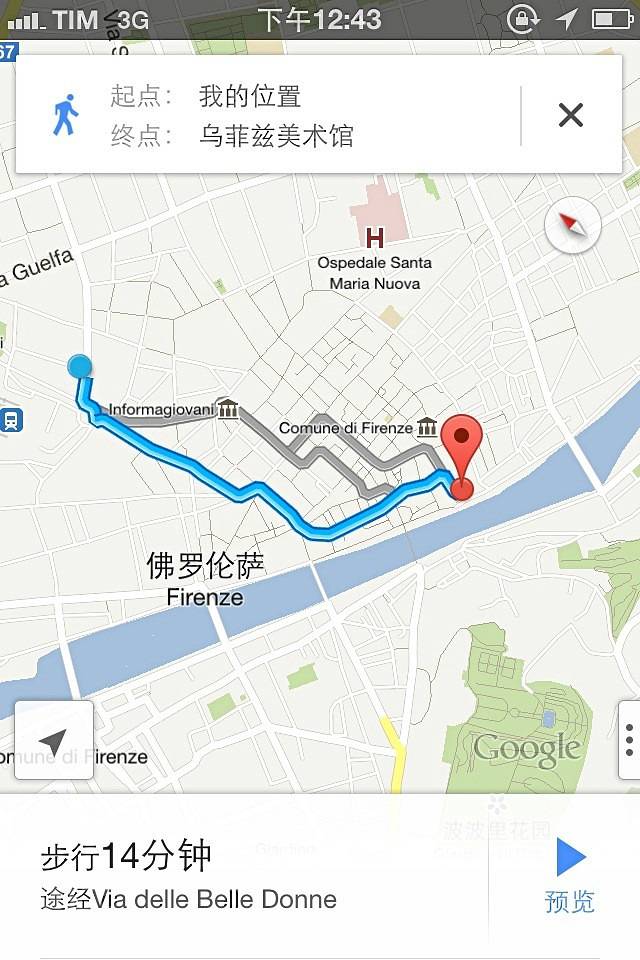 在佛罗伦萨建议玩两天,因为老城区不算大,除了米开朗基罗广场,基本上可以通过步行来游玩,我们走之前下载了谷歌地图,到了罗马的时候又买了当地的TIM卡可以免费上网,基本上去景点都是直接在谷歌地图上搜,然后跟着闪烁的蓝色圆点走。