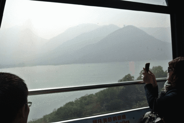 缆车,是我们初登大屿山看到的第一个“景色”,之所以加引号,是因为我到现在都不认为缆车是景点,这只不过是一种乘坐体验罢了。不过3分钟左右的缆车行程,却让我现将着空灵的大屿山看了个遍,延绵的山峰,不吵不闹的沉浸在白色的晨雾中。水面上没有青山的倒影,各自为态,反而更显的幽静,山间刚刚升起不久的太阳,巧妙的勾勒出整个大屿山的轮廓,还为这动人的画面填上了一抹浓淡相宜的颜色,像是一幅年代久远的水墨画,氤氲着厚厚的水汽,亦真亦幻。