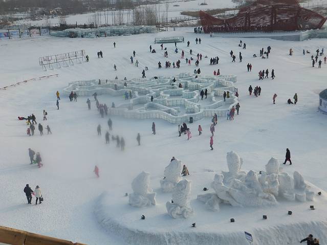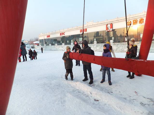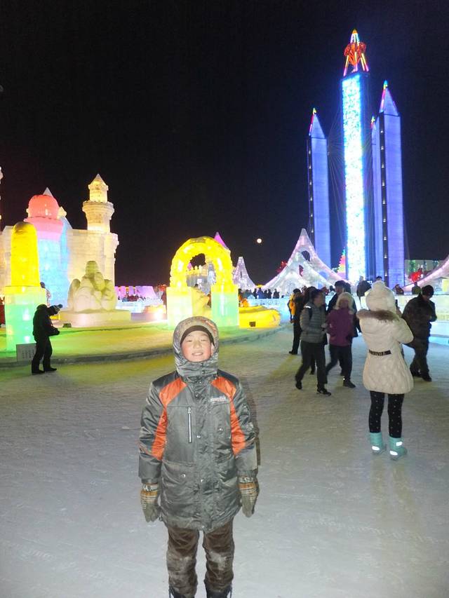 2月4日哈尔滨的温度很高,晚上零下十几度,但是在外面时间长了还是冷,尤其冻脚,我穿很厚的鞋还是冻透了。排队时前面有一家从南方来的一家四口,年轻的夫妇领着大概5岁的女儿和约3岁的儿子,小女孩可冻坏了,哭着说冷要走,他的爸爸让她搓搓手,自己还示范,拿些雪在手里搓。我看不下去了,告诉家长孩子太小,冻透了,应该带她到暖和的屋子,后来他的老婆带着两个孩子走了,男的留下来排队玩滑雪板。