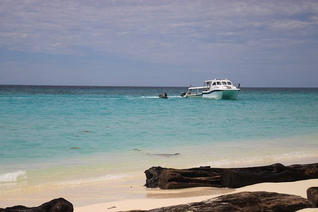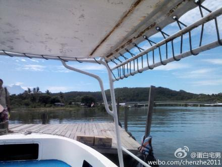 由于早上7:00就要出发去美人鱼岛,因此早上6:00就早早起床了。吃了顿丰富的早餐,早上起来的时候还看到在下雨,还在担心今天上不了岛。不过联系代理后说没有问题可以上岛。大概7:15的样子代理的车子就来接我们了,开车的是个华人老爷子,英文说的很好,车开的也很稳,人也很客气。大概开了2个半小时的车(中途还停了下车小伙伴们去取钱)才到出发的码头。这时候看到了阳光明媚了,心安定了。到了码头把余下的钱给了司机,小伙伴还担心钱给了他们不办事,我就安慰他不要用中国人的心理去考量马国人。事实也证明确实如此。当地人都很友善和纯朴。上船前还可以拿些浮潜的装备,但救生背心必须要穿。上岛的代理是LOW PRICE,也就是经常看到的“特优旅游”,导游叫阿宝,上船前阿宝向大家叮嘱注意事项,要穿好救生背心。另外一家叫“PALM BEACH”,我们住的PBR