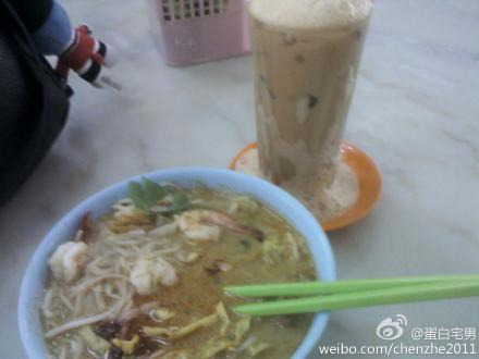 继续逛街,吃了怡丰茶室,逛了周末市集,晚上的航班回吉隆坡早上同屋的一个小伙伴提前出发了,还有一个是下午直飞杭州。我们五个人最晚出发,我一直耗到11:30才去退房,出去准备找吃的。问了一圈酒店的班车,原来是隔壁百盛的班车,在商场的后门,每隔一个小时一班,开到菲律宾市场附近的一个商场,从这里走到GAYA街大概15分钟,不算很远。本来想去吃肉骨茶,但好几家店都没有开,要到下午2点才开,路过怡丰就进去吃了,点了一份大碗的LARSAK 和拉茶,味道很浓,拉茶很不错,有咖啡和茶的味道,一共9.5RM。