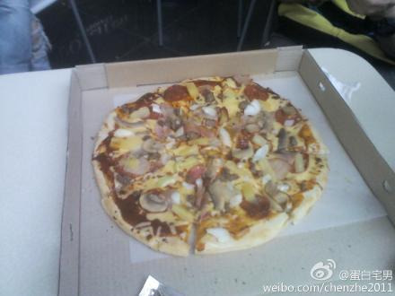 我们在吃饼的时候小伙伴又去买了个PIZZA回来了,内容还挺丰富的,味道也不错,好象是8寸的,够我们五个人吃的了。大概折合人民币35块左右。
